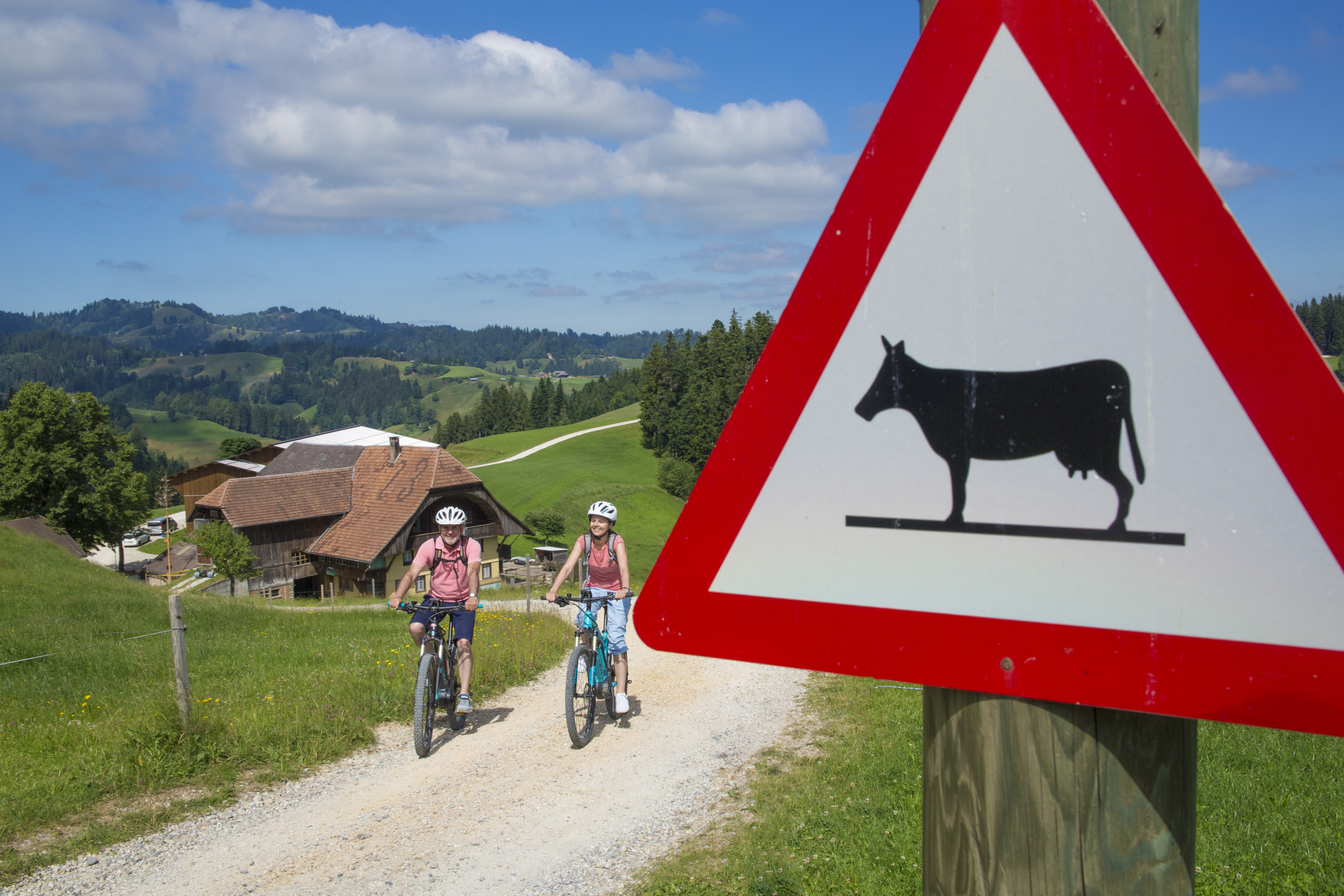 Diese herzhafte Tour zeigt die beiden Gesichter des Emmentals: Hügel und Tallandschaft. Die Strecke ist in beide Richtungen beschildert als Route 99 «Herzroute» und Route 24.